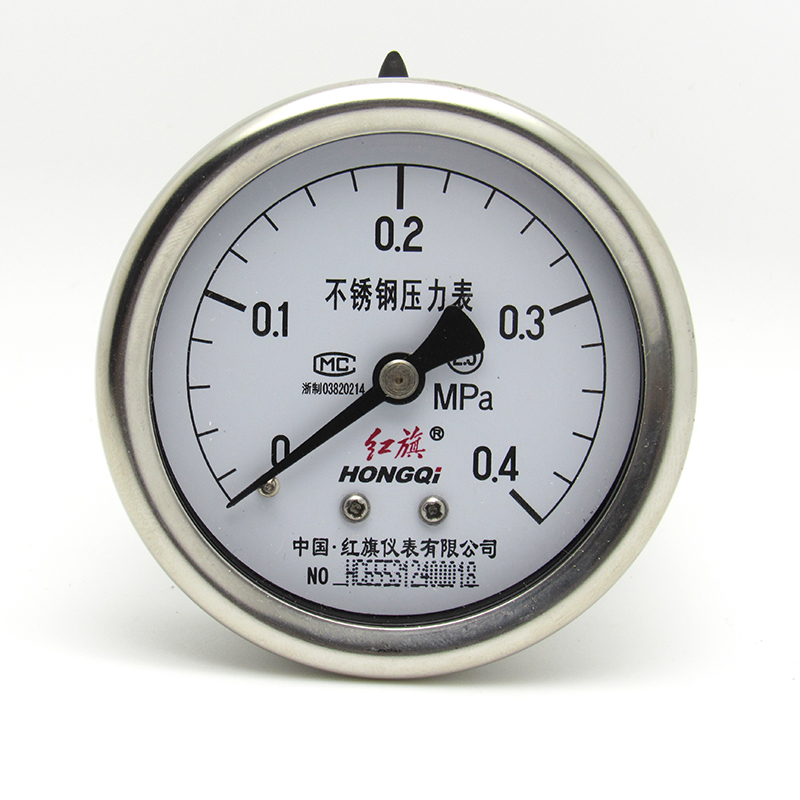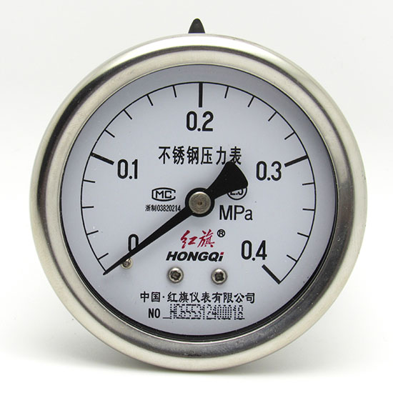 不銹鋼壓力表由導(dǎo)壓系統(tǒng)(包括接頭、彈簧管、限流螺釘?shù)?、齒輪傳動機(jī)構(gòu)、示數(shù)裝置(指針與度盤)和外殼(包括表殼、表蓋、表玻璃等)所組成。